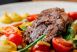 Steak salát s filírovanou vepřovou panenkou, rukola, fazolky, marinovaná cibule,